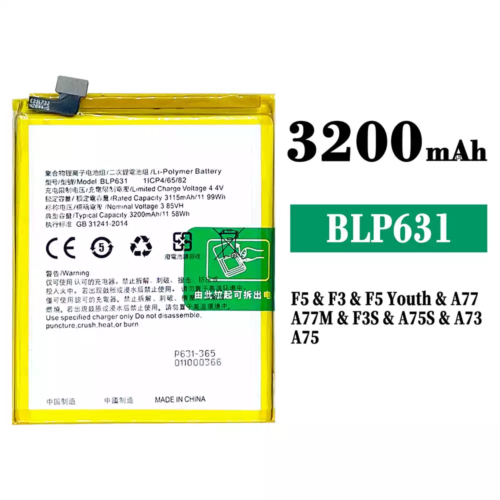 Batteria BLP631 per OPPO F5 / F5 Plus / CPH1723 / CPH1727 / CHP1723 / CHP1727 / F5 Youth / A73 /CPH1725 / F3 / CPH1609 / A77 / CPHl715 / A75